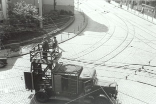 | Bei gerissenen Spanndrähten rückt das Team von Turmwagen 108 auch in der Hauptverkehrs- zeit aus: hier am Schlagbaum, 1998 |